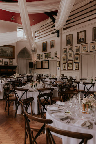 Style Notes: The soft romantic elements of the draping, pastel flowers, and tapered candles were the perfect contrast with the wood and rustic rowing club setting.